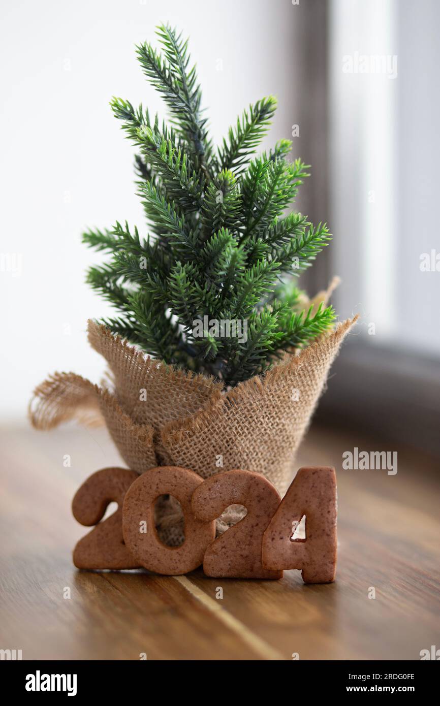 Lebkekse in der Form der Zahlen 2024 neben einem Topf mit einem